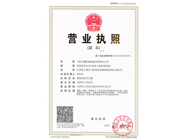 • 09-28弋陽大鵬機械制造有限責任公司成功取得規范